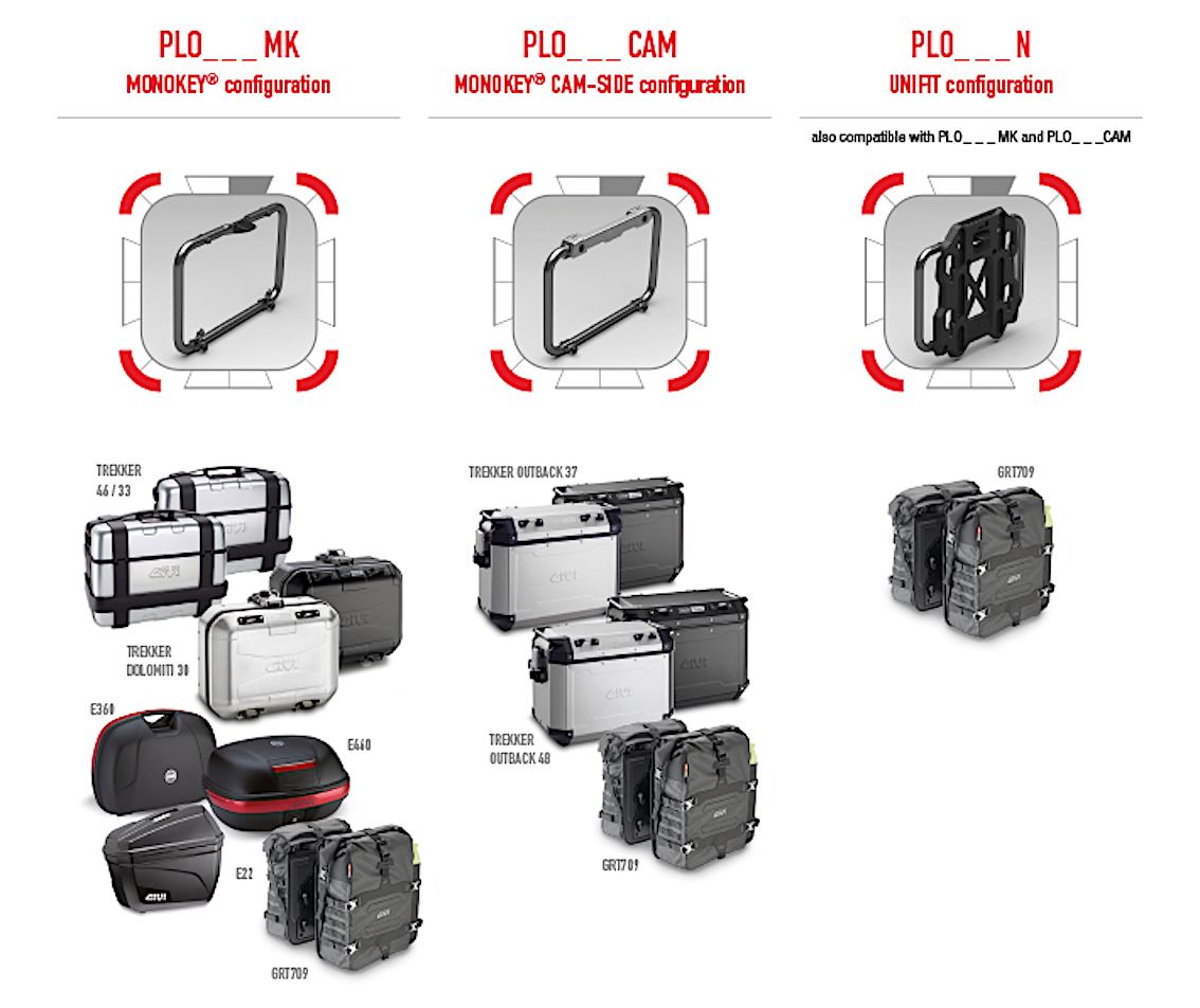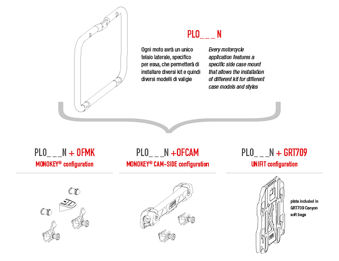 Il progetto PL ONE-FIT prevede un tubolare, specifico per ogni modello di moto, al quale è possibile assemblare un kit che renderà compatibile il sistema di aggancio della valigia laterale GIVI scelta. Cambi valigie e sistema di aggancio? Basterà dotarsi del kit adeguato: il telaio tubolare connesso alla moto non andrà cambiato e potrà essere utilizzato con valigie MONOKEY, MONOKEY CAM SIDE, TREKKER OUTBACK ma anche le morbide GRT709.