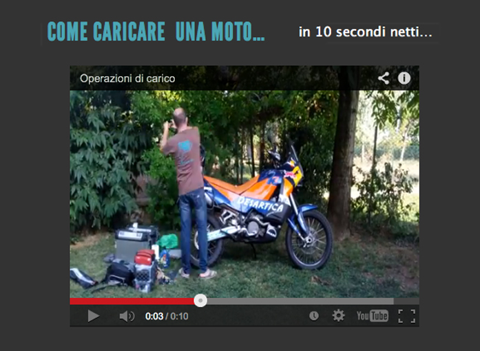 Stefano presenta le sue recensioni sugli accessori utilizzati e mostra come “caricare” una moto… in soli 10 secondi.